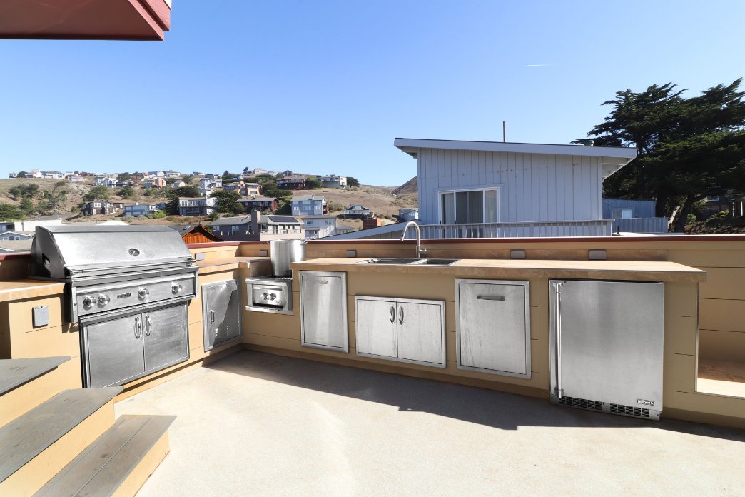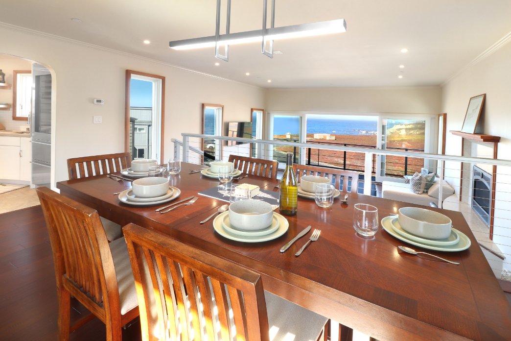 At the end of the hall, is the master bedroom with wall to wall ocean views. You’ll feel at home with the XL rattan swivel chair (for your morning coffee), beautiful decor, folding desks, and the plush king bed! Our guests are going to need various sets of clothes, to go from wine tasting, beach bumming, surfing, fishing, hiking etc… That’s why all the bedrooms in the house have huge built-in shelves and/or dressers to store your clothes and valuables. In front of the kitchen, our guests can dine together on the dining table while enjoying the expansive, full ocean views. You’ll have the choice of colorful, artistic dinnerware for casual dining, as well as, the seafood themed dinnerware and wine glasses for fine dining. The table is nestled above the living area so that those watching tv can’t interfere with the adult conversations. There is also an outdoor deck to relax on if you just want some sun away from the wind.
