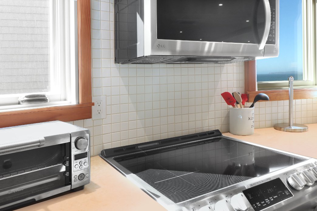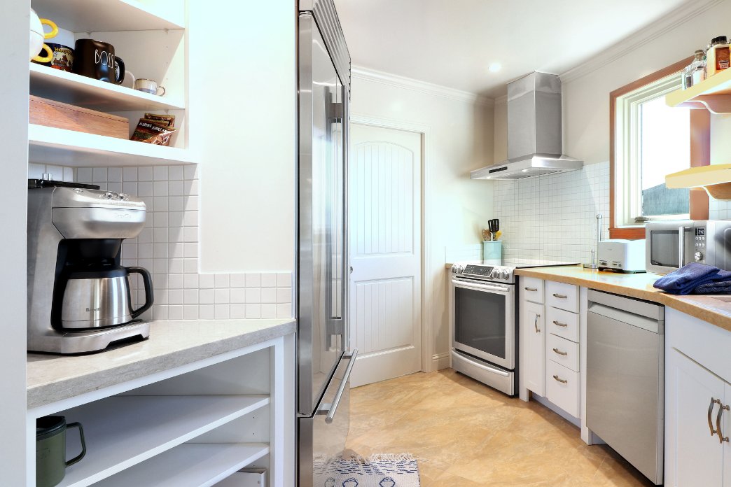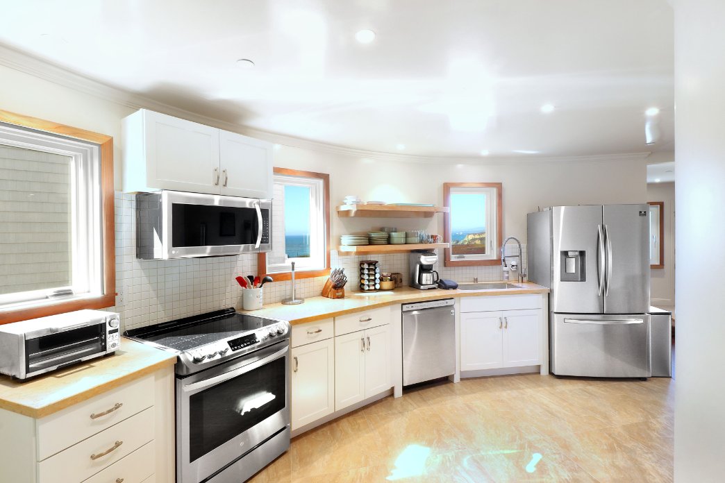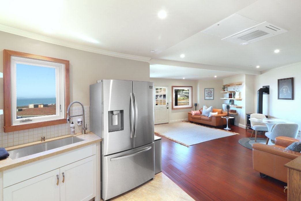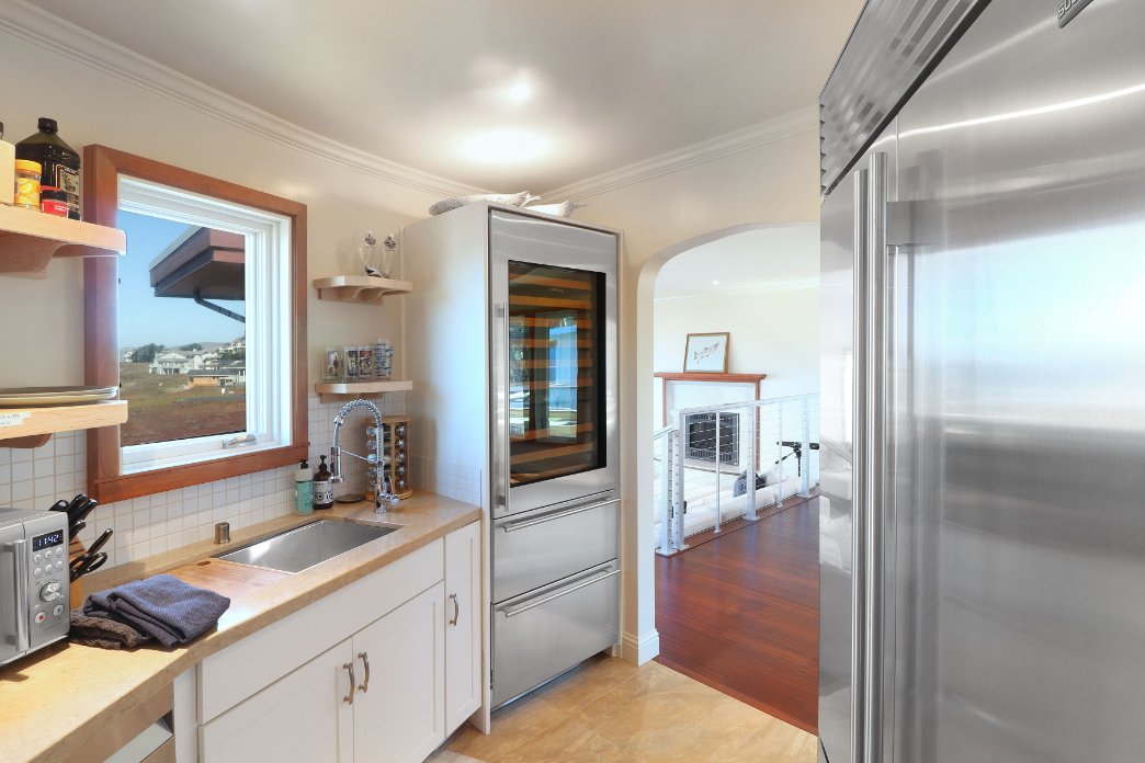 When you’ve tracked some dirt onto your clothes, next to the kitchen is the laundry room, It has a large capacity washer and dryer. These whisper quiet appliances are located next to a stainless steel sink for those handwash delicates. Yes, our guests can marvel at Bodega Bay while doing the laundry!