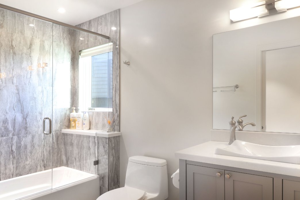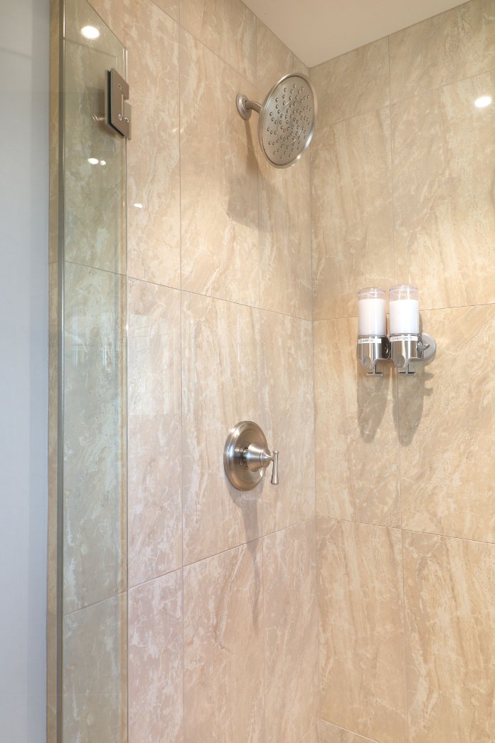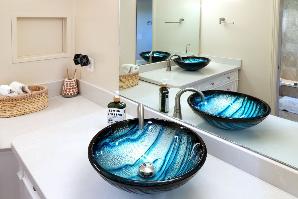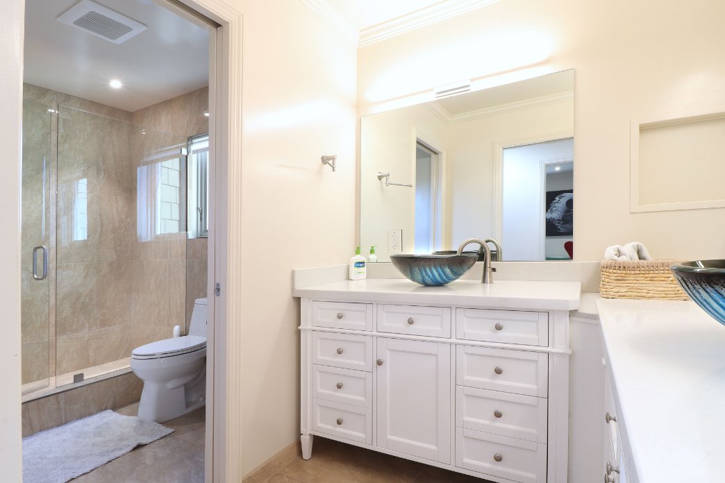 Also on the right of the staircase, there is a large full bathroom with two pedestal sinks. The opal blue sinks are resting atop James Martin vanities. They will remind our guests of the deep blue sea just outside!