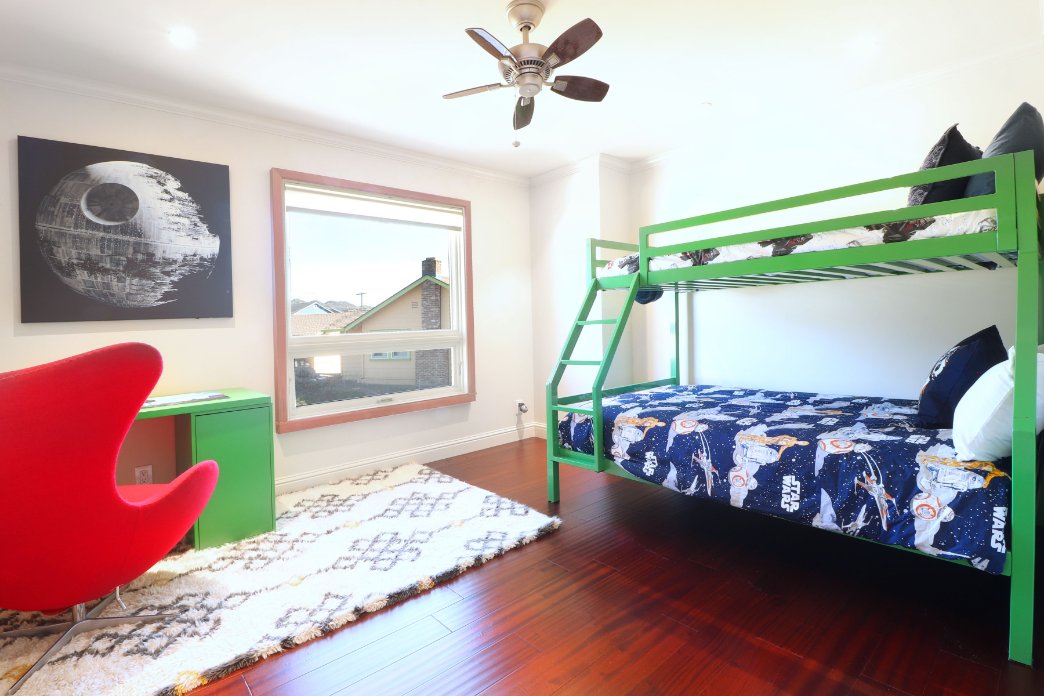 To the right of the staircase, is the Star Wars room. There are Tie Fighter night lights, Death Stars blankets, and other things for you to discover! There’s a single and double bunk bed to rest in. With plenty of room for up to three people!